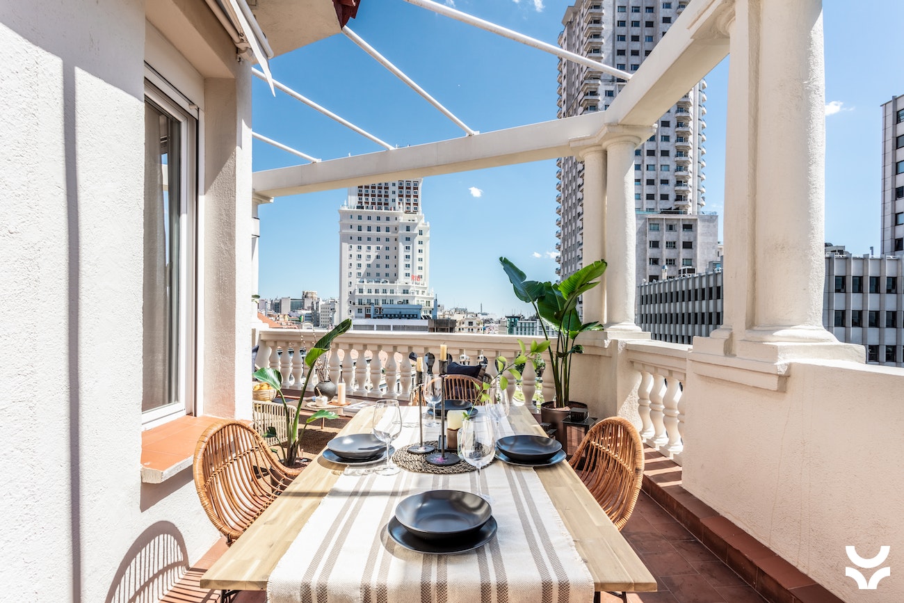 Espectacular ático con terraza, amueblado y equipado en la calle Princesa, junto a la Plaza de España y Gran Vía, en el céntrico barrio de Malasaña.