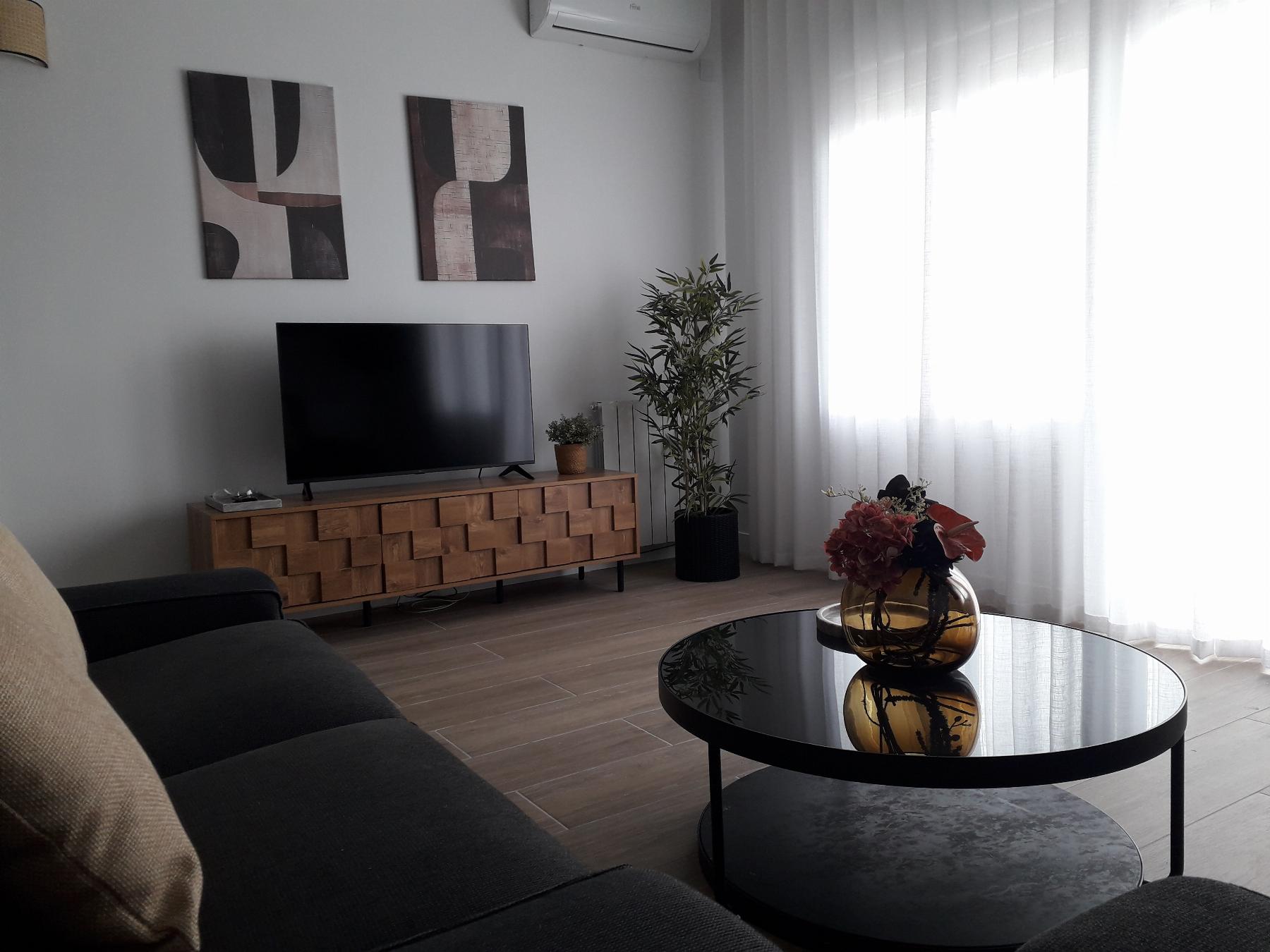 Salón-comedor compuesto de mesa comedor para 4 comensales, 2 sofás y TV con acceso a terraza y vistas al paseo.